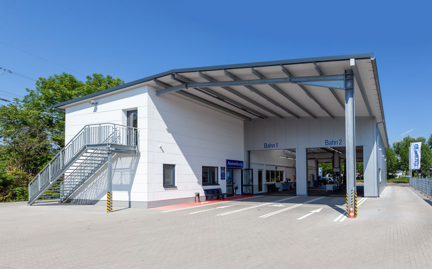 Ein angenehmes Arbeitsumfeld, eine hohe Funktionalität und eine offene Atmosphäre für Besucher – diese und weitere zahlreiche Aspekte standen bei der Planung des Komplexes einer modernen TÜV-Halle nebst Büroräumen im Fokus. Die Gestaltung erfolgte bewusst offen und hell. Die Bauweise gewährleistet viel Raum für Kommunikation und funktionales Arbeiten, die Ausführung erfolgte in teilweise 2-geschossiger Bauweise unter optimaler Ausnutzung der gegebenen räumlichen Vorgaben des Geländes.